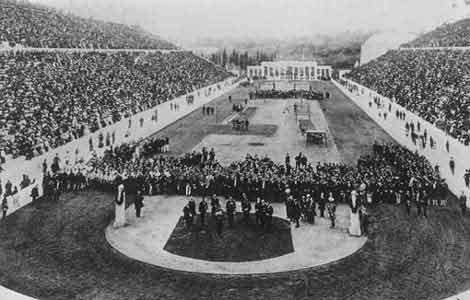 Am 6. April 1896 eröffnete der griechische König Georg I. vor mehr als 70.000 begeisterten Zuschauern im Stadion von Athen die I. Olympischen Spiele der Neuzeit. Die Entscheidung für die griechische Hauptstadt Athen als Austragungsort der ersten Olympischen Spiele stellte das Land vor große finanzielle Probleme. Schließlich kamen 300.000 Golddrachmen durch Sammlungen in der Bevölkerung zusammen, doch erst die großzügige Spende des griechischen Millionärs Georgios Averhoff sicherte die Finanzierung. |