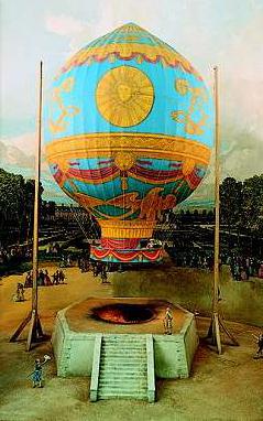 Étienne-Jacques de Montgolfier, geboren am 6. Januar 1745, erfand zusammen mit seinem Bruder Michel-Joseph den Heißluftballon. Sie stellten in der väterlichen Papierfabrik Versuche mit leichten, rauchgefüllten Papiersäcken an, die sie aufsteigen ließen. Am 5.6.1783 stieg der erste, aus Leinwand gefertigte, mit Papier gefütterte und mit einem Hanfnetz überzogene, unbemannte Heißluftballon, eine Montgolfiere, vom Marktplatz von Annonay zu einem Fesselflug auf. Dabei wurde die Luft im unten offenen Ballon durch ein Becken mit glühender Holzkohle erwärmt. Am 19.9.1783 schickte man einen Hahn, eine Ente und ein Schaf in die Luft, die wohlbehalten wieder landeten. Die erste bemannte Ballonfahrt fand am 21.11.1783 in der Nähe von Paris statt. |