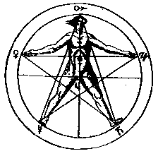 | Der Philosoph und Magier Agrippa von Nettesheim zeichnete im 16. Jh. das aufrecht stehende Pentagramm als Symbol des Menschen; der Mensch steht im Pentagramm, in vier Strahlen die Gliedmaßen, der fünfte umschließt den Kopf. Umgeben ist der Stern von astrologischen Planetensymbolen. Der Mensch mit seinen fünf Sinnen und den fünf Fingern ist für ihn die Quintessenz der Schöpfung. |