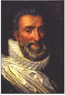 Die von Martin Luther ausgelöste Reformationsbewegung erfasste die europäischen Staaten und spaltete auch Frankreich tief. Der Bourbone Heinrich (seit 1562 König von Navarra) war Kalvinist und wurde 1581 zum Führer der Hugenotten. 1572 hatte er durch seine Heirat mit Margarete, der Schwester der drei letzten Valoiskönige Frankreichs, versucht, zu einer Aussöhnung mit der strikt katholischen Partei zu kommen, was jedoch nicht gelang. Seine Vermählung ging als "Bluthochzeit von Paris" oder auch "Bartholomäusnacht" in die Geschichte ein. Die im Gefolge Heinrichs zur Vermählung nach Paris angereisten Hugenottenführer mit Tausenden ihrer Glaubensgenossen wurden getötet. In Paris gab es über 3000 Opfer, im ganzen Land wurden mehr als 10 000 Hugenotten ermordet. Heinrich selber konnte sein Leben nur durch Abschwören seines Glaubens retten und wurde bei Hof gefangen gehalten, 1576 gelang ihm die Flucht. |