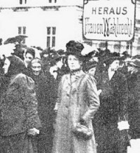 Auf der ersten Deutschen Frauenkonferenz in Leipzig wurde am 18. Oktober 1865 u.a. durch Louise Otto-Peters der Allgemeine Deutsche Frauenverein (ADF) gegründet. Schon 1848 hatten Frauen Mündigkeit und Selbständigkeit gefordert, doch sie wurden durch das Versammlungs- und Vereinigungsrecht daran gehindert, sich zusammenzuschließen; Frauen, Kindern und Geisteskranken war die Mitgliedschaft in einem Verein nicht erlaubt. Ziel des ADF war es, das Recht der Frauen auf höhere Bildung und Erwerbsarbeit durchzusetzen. Er engagierte sich u.a. für die Gewerbefreiheit für Frauen, die Zulassung der Berufstätigkeit für unverheiratete Frauen zur Einkommenssicherung sowie für die Einführung von Mädchenschulen. Ab 1900 wurde es möglich, an Universitäten zu studieren, 1920 erhielten Frauen das Habilitationsrecht, ab 1908 konnten Frauen auch Mitglieder von Parteien werden. Für die Fabrik- und Lohnarbeiterinnen war das Recht auf Arbeit kaum ein Thema. Ihre Zahl stieg im 19. Jahrhundert kontinuierlich an, da ging es um die Verbesserung der harten Arbeitsbedingungen, um die viel schlechtere Bezahlung im Vergleich zu den männlichen Kollegen, sowie um Mutterschutz. Die Belange der Arbeiterinnen wurden von der proletarischen Frauenbewegung mit Clara Zetkin an ihrer Spitze vertreten. |